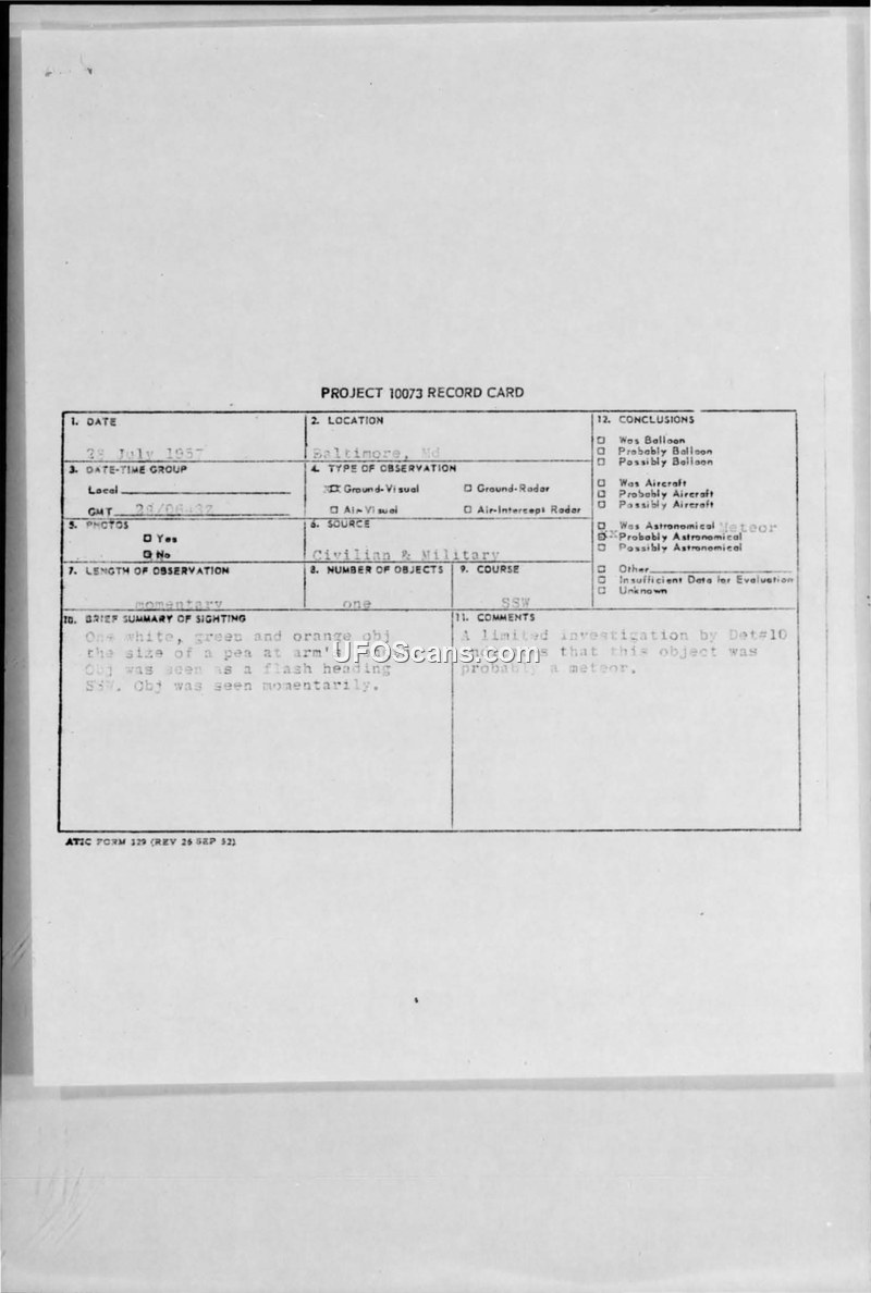 Project 10073 Record Card — Sighting in Baltimore, Maryland, July 1957