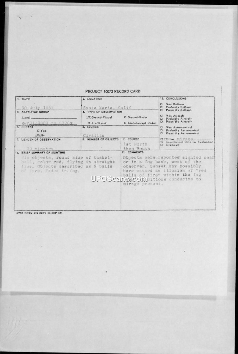 This document is a Project 10073 record card and associated military cable detailing a UFO sighting that occurred on July 30, 1957, near Santa Maria, California. A civilian witness reported observing six round, red objects, each approximately the size of a basketball, flying in a straight line. The objects were initially seen moving north and then south before fading into a fog bank. The total duration of the sighting was twenty minutes. The military investigation, led by 1st Lt. Robert B. Hilman, concluded that the objects were likely an optical illusion. The report notes that the objects were sighted near or within a fog bank to the west of the observer, and that the sunset may have created the appearance of 'red balls of fire.' The investigators determined that atmospheric conditions at the time were conducive to the formation of a mirage, which served as the official explanation for the event.