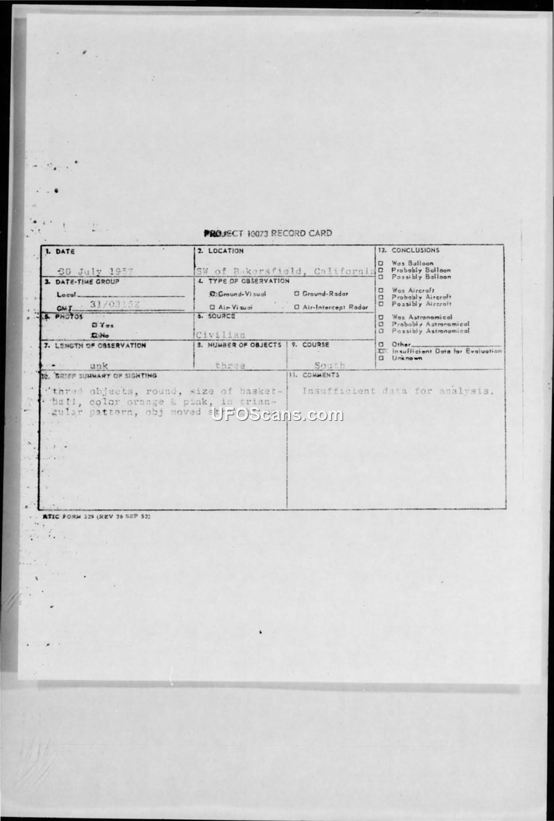 Project 10073 Record Card — Sighting near Bakersfield, California, 30 July 1957