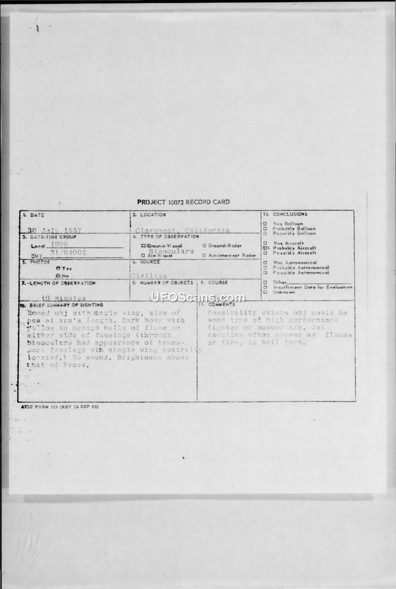 Project 10073 Record Card and Air Intelligence Information Report — Claremont, California, 30 July 1957
