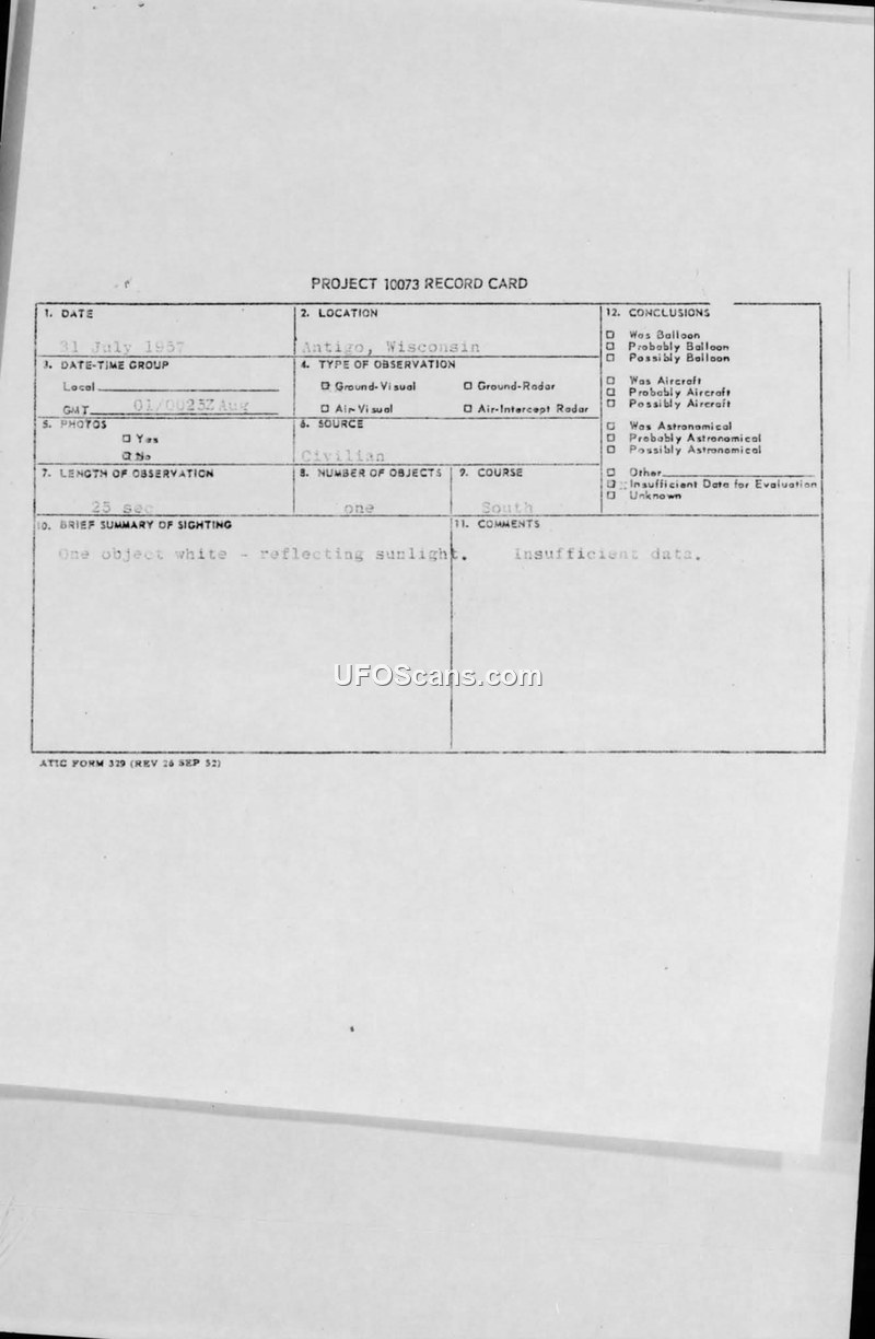 Project 10073 Record Cards and Related UAP Sighting Reports, August 1957