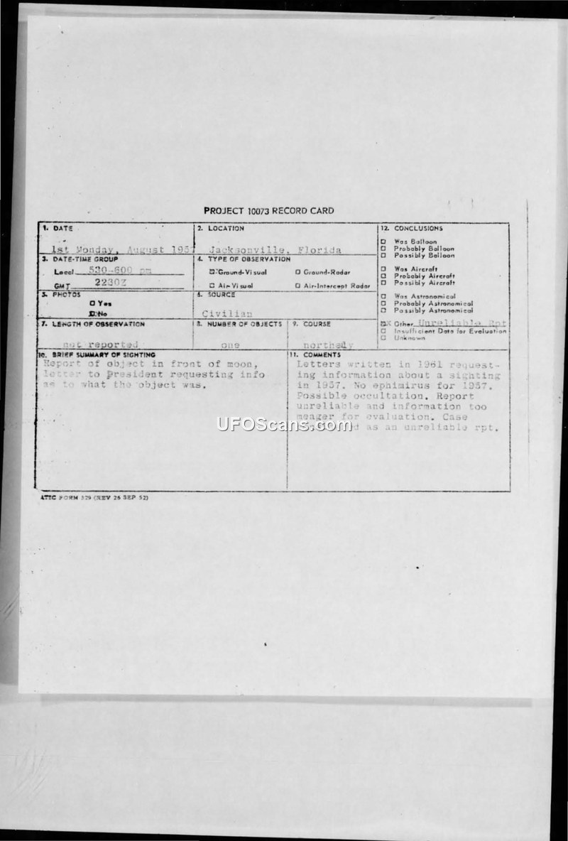 This document consists of a Project 10073 record card and subsequent correspondence regarding a civilian sighting of an unidentified object in Jacksonville, Florida, on the first Monday of August 1957. The witness reported observing an object in front of the moon, which they described as yellow and moving in a northerly direction. The report was not filed until 1961, when the witness wrote to the Office of the President requesting information about the object. The Air Force, acting on behalf of the President, responded to the witness, acknowledging their interest and stating that the Air Force is responsible for the investigation and evaluation of unidentified flying object sightings. The internal evaluation on the record card concludes that the report is unreliable and contains insufficient data for a formal evaluation. The investigator noted that there was no ephemeris available for 1957 to verify the sighting and suggested the possibility of an occultation. The file includes the original record card, copies of the draft and final response letters from the Air Force, and a handwritten letter from the witness detailing their observations, including a sketch of the object's position relative to the moon.
