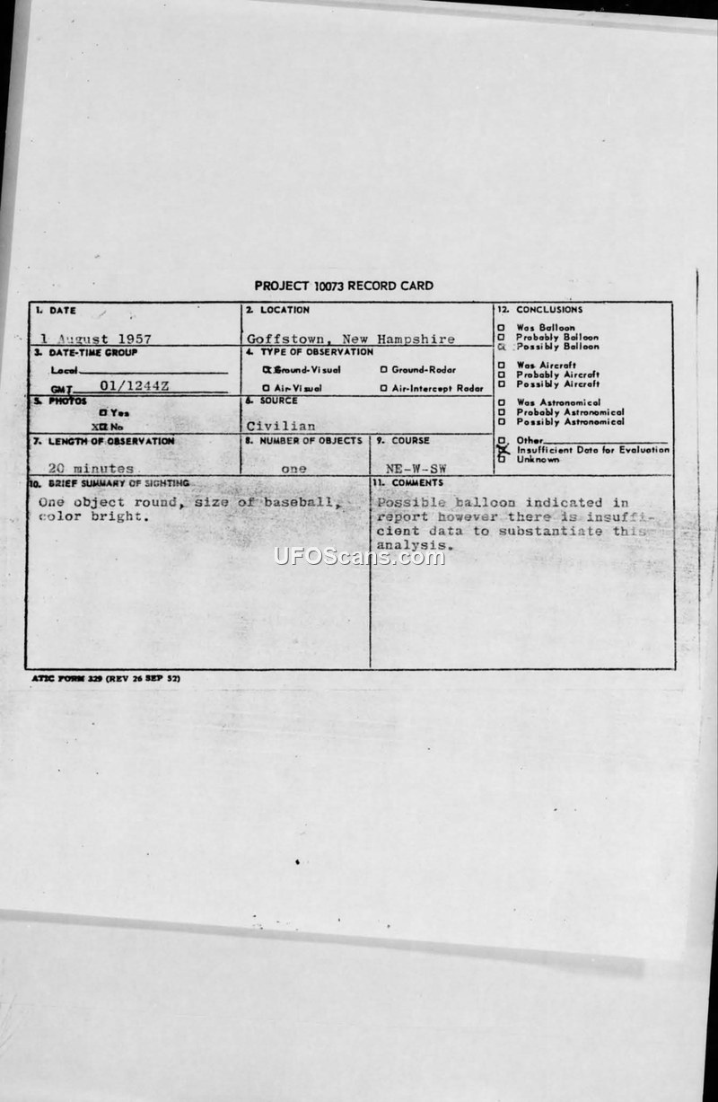 A civilian reported a round, bright, baseball-sized object in Goffstown, NH, on 1 August 1957. ATIC concluded there was insufficient data to confirm the object's identity, though a balloon was considered a possibility.