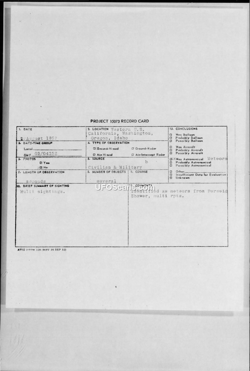 This document collection details a series of reports regarding an unidentified aerial phenomenon observed on 2 August 1957 across the Western United States, including California, Washington, Oregon, and Idaho. The primary report originates from the 859th Aircraft Control and Warning Squadron at Red Bluff Air Force Station, California. Witnesses described a round, white object, approximately the size of a baseball, which traveled in a straight line at a high rate of speed. The object reportedly exhibited a yellow fringe, a blue tail, and later shifted to a bluish and greenish color before disintegrating. Observers noted that the object appeared to emit star-like shells before exploding noiselessly. The duration of the sighting was estimated at five to six seconds. Military personnel and official evaluators, including the 408th Fighter Group, concluded that the phenomenon was a meteor or meteorite, noting that the event coincided with the annual Perseid meteor shower. The reports emphasize that no physical evidence, such as photographs or material remains, was recovered. The documentation includes internal military correspondence, record cards, and press clippings, which highlight the public interest and the subsequent media coverage of the event. The Air Force consultants and investigators consistently categorized the sighting as a meteor, dismissing reports of it being an unidentified flying object. The documents also reflect a critical perspective on how such events are interpreted by UFO researchers versus military authorities, with the latter maintaining that the sightings were natural astronomical phenomena.