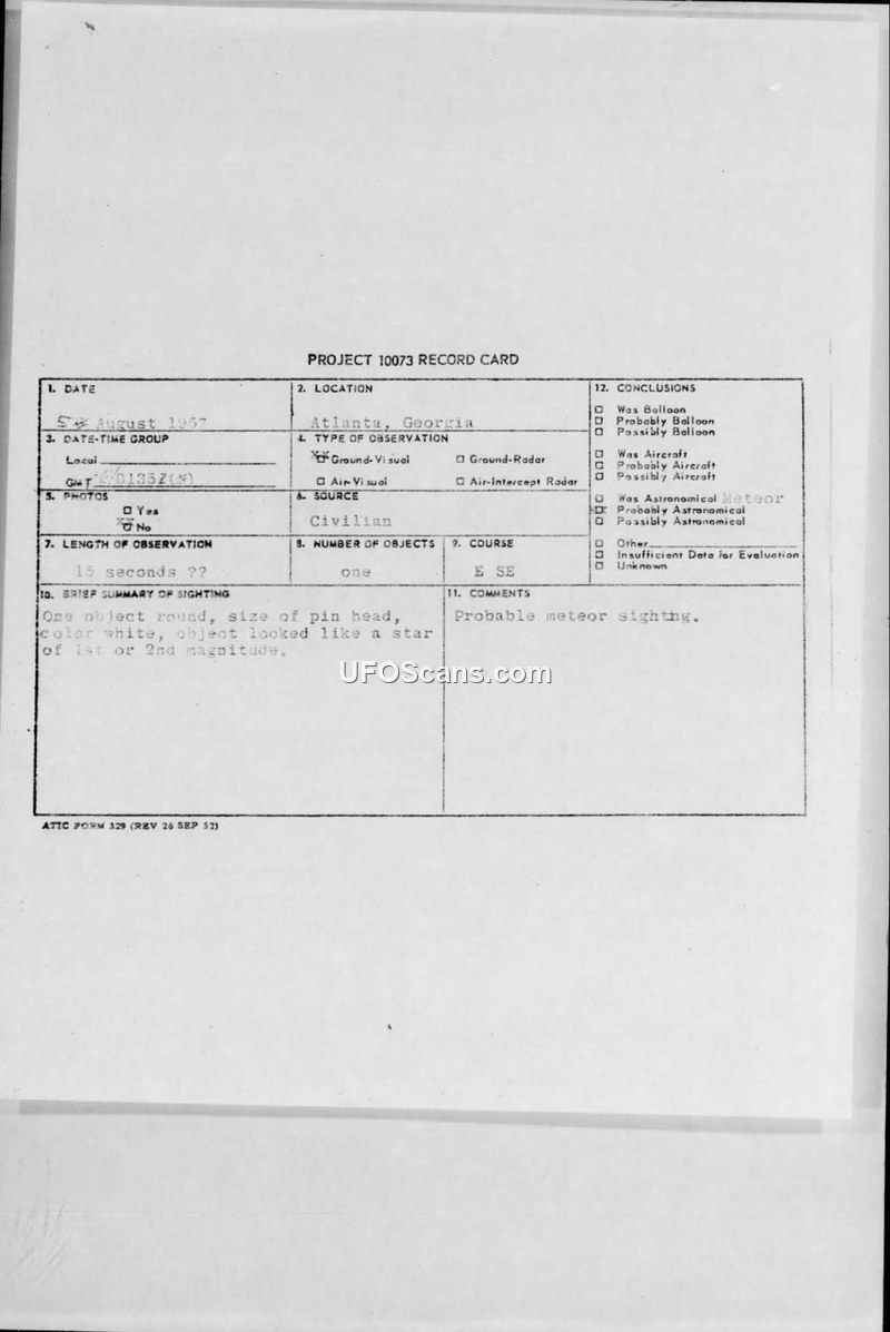 Project 10073 Record Card - Atlanta, Georgia - 5 August 1957