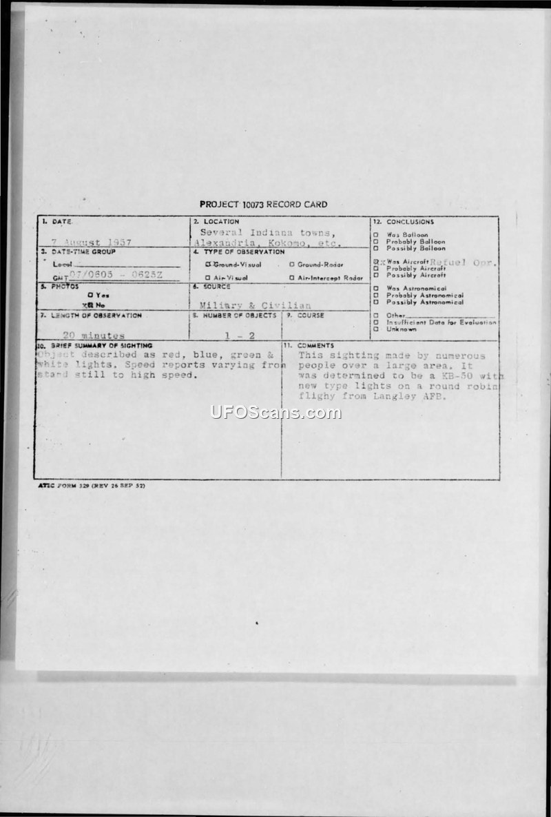 On August 7, 1957, multiple sightings of unidentified colored lights occurred across Indiana. The Air Technical Intelligence Center (ATIC) officially identified the objects as a KB-50 refueling tanker aircraft.