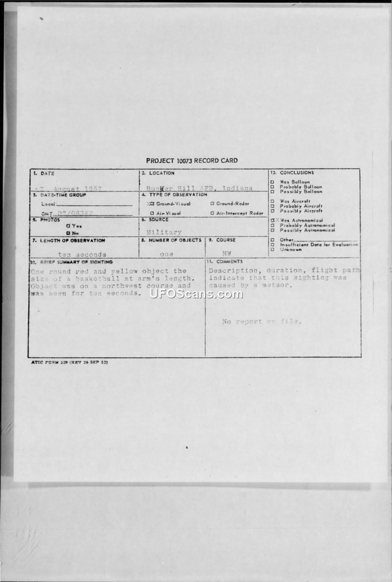Project 10073 Record Card — Bunker Hill AFB, Indiana, August 1957