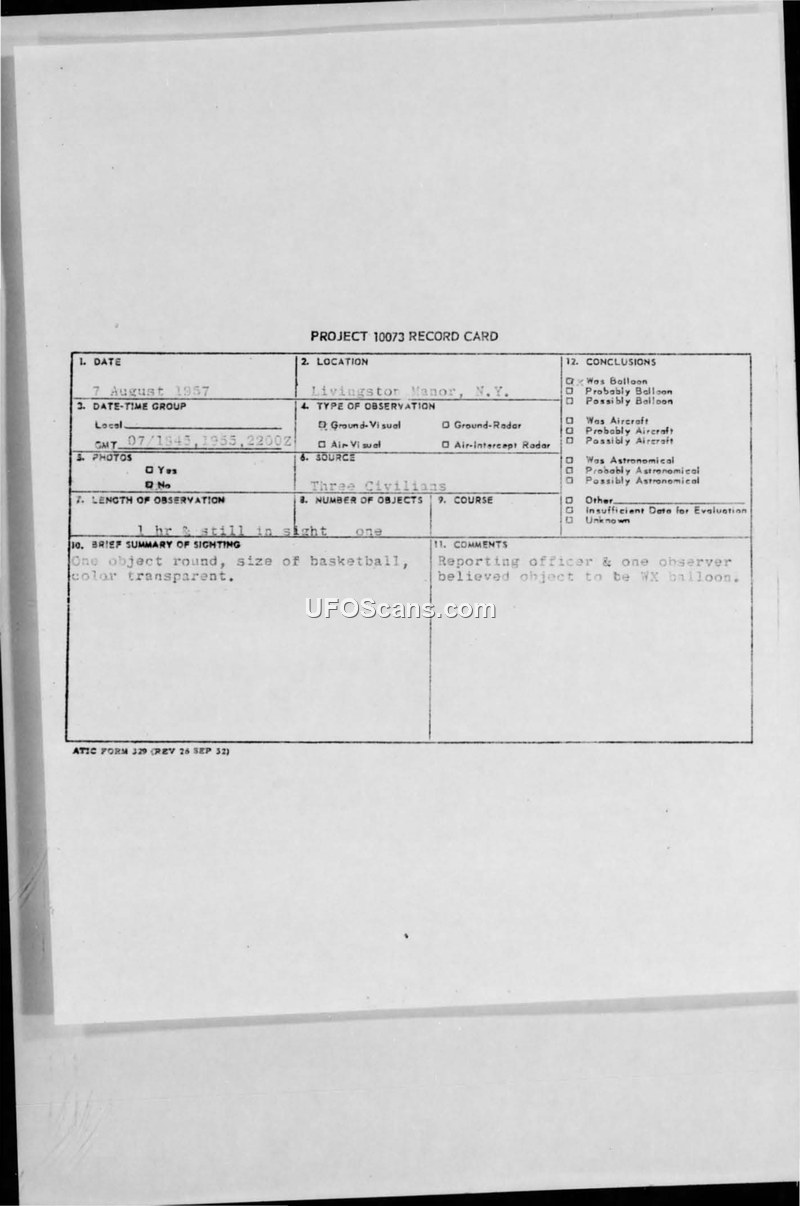 Project 10073 Record Card — Livingston Manor, N.Y., 7 August 1957