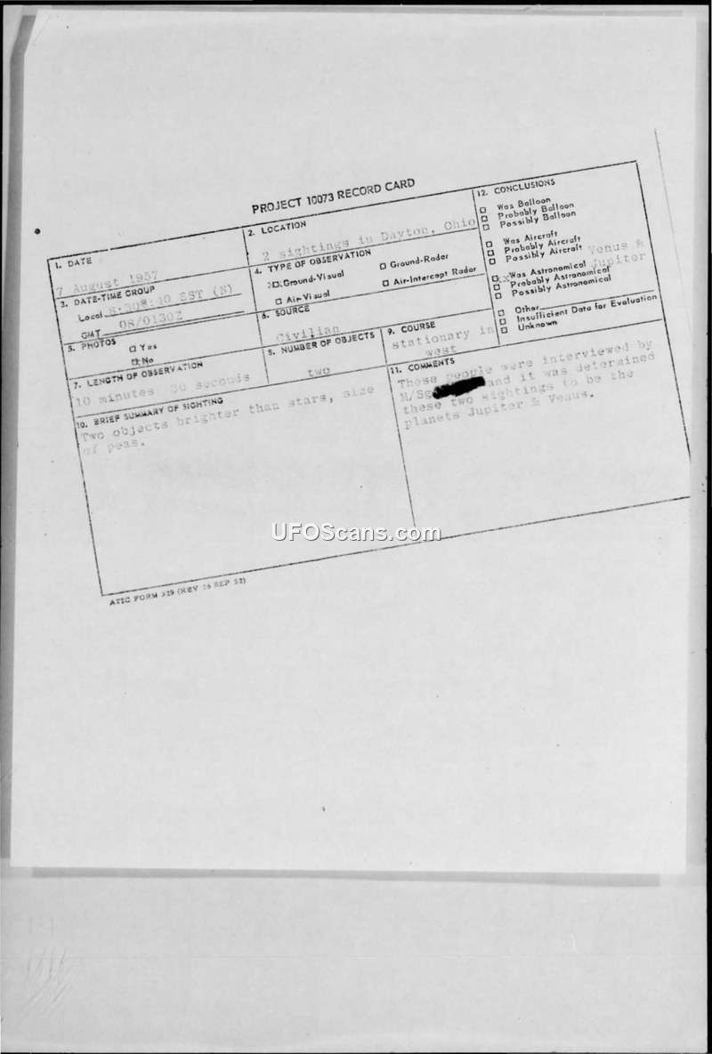 Project 10073 Record Card — 2 Sightings in Dayton, Ohio, 7 August 1957