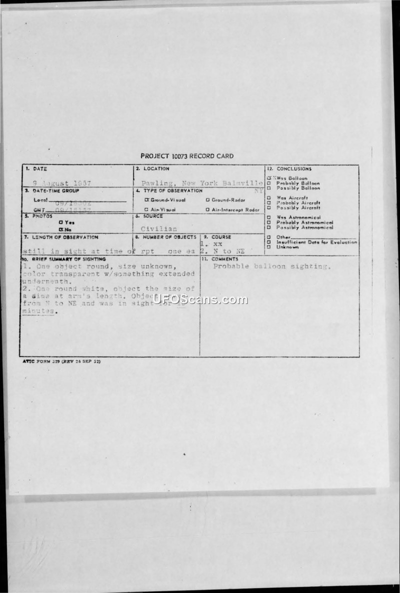 Project 10073 Record Card — Balmville, New York, 9 August 1957