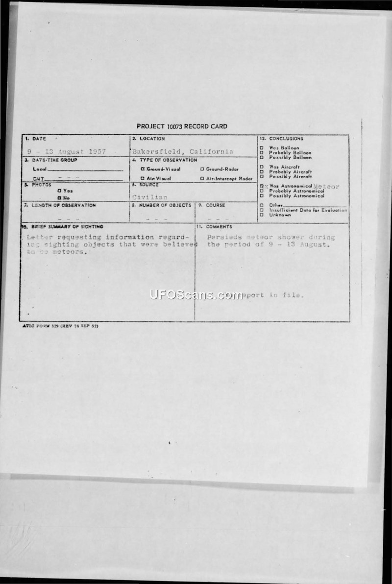A civilian report of an unidentified aerial object in Bakersfield, California, was investigated by the Air Technical Intelligence Center. The Air Force concluded the sighting was a result of the Perseids meteor shower.