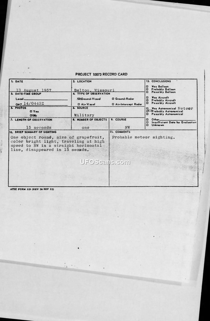A 1957 military report from Belton, Missouri, documents a 15-second sighting of a bright, round object moving at high speed. The official conclusion reached by the 20th Air Division was that the object was a probable meteor.