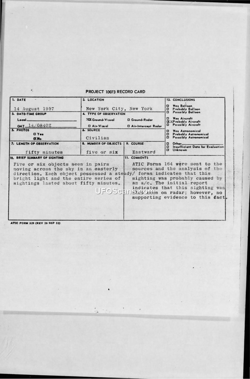 Project 10073 Record Card — New York City, 14 August 1957