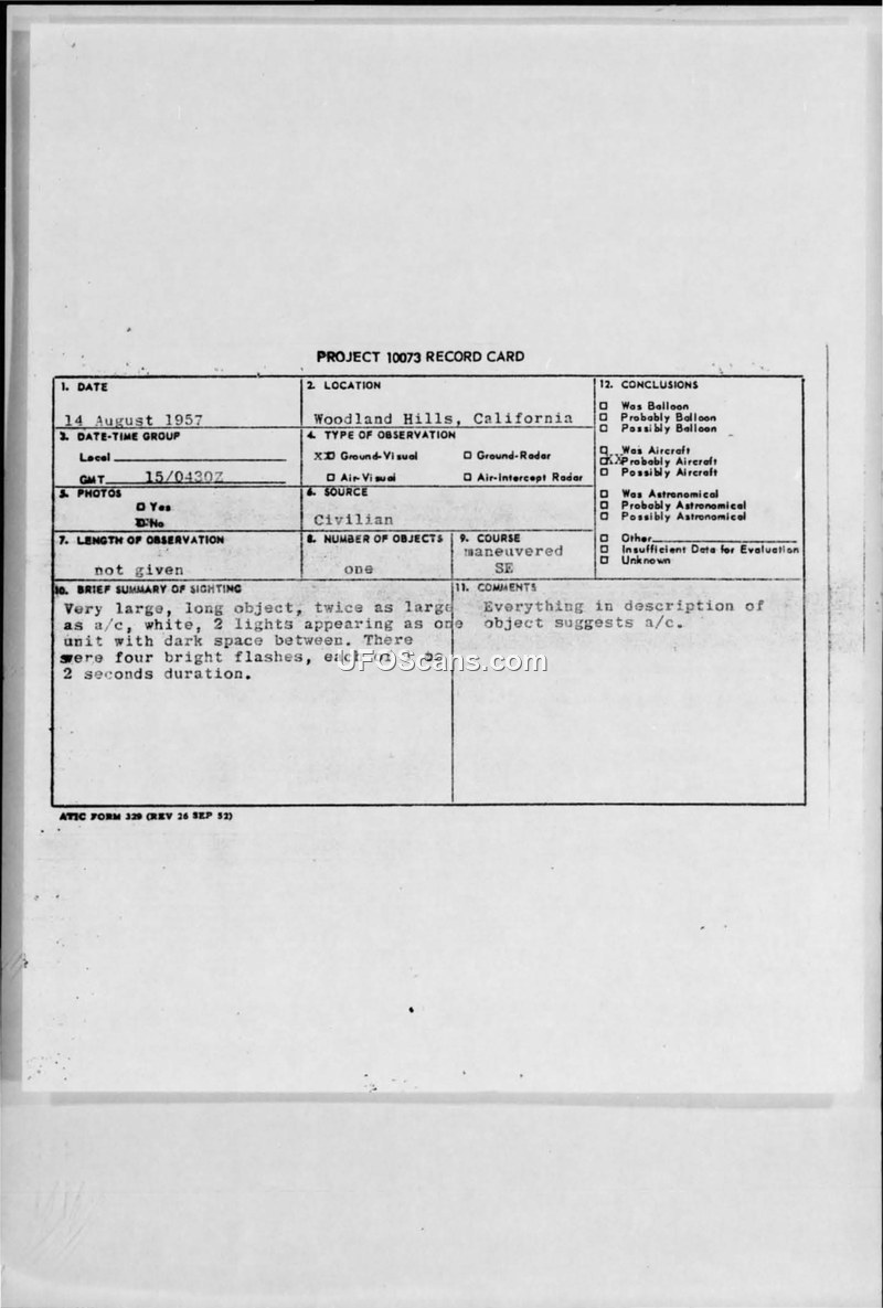 Project 10073 Record Card — Woodland Hills, California, 14 August 1957