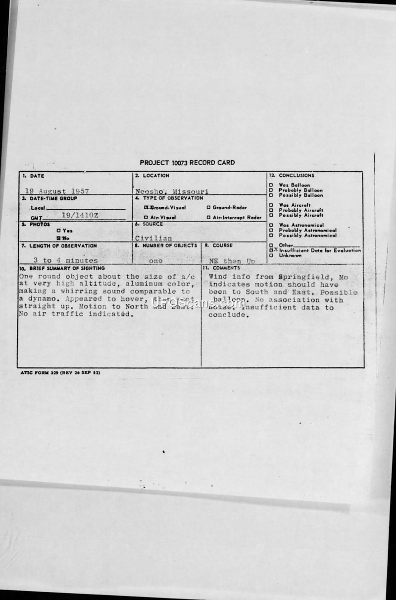 Project 10073 Record Card and Detachment #5 Report — Neosho, Missouri, 19 August 1957