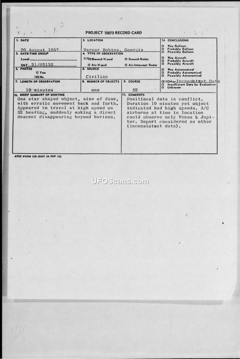 On 20 August 1957, a civilian witness in Warner Robins, Georgia, reported observing a single, white, star-shaped object, described as being the size of a dime. The witness claimed the object exhibited erratic movement, traveling at high speed on a southeast heading before making a direct descent and disappearing beyond the horizon. The observation lasted approximately ten minutes. The report was processed under Project 10073 and submitted in compliance with Air Force Regulation 200-2. Upon investigation, military officials, including Captain Jerry E. Moore, determined the report to be inconsistent. The investigation noted that a B-57 aircraft operating in the area at the time of the sighting reported seeing only two planets. It was concluded that the witness likely mistook Venus or Jupiter for a piloted object. The investigating officer explicitly noted that the observer was considered highly unreliable based on the conflicting positional data provided in the report.