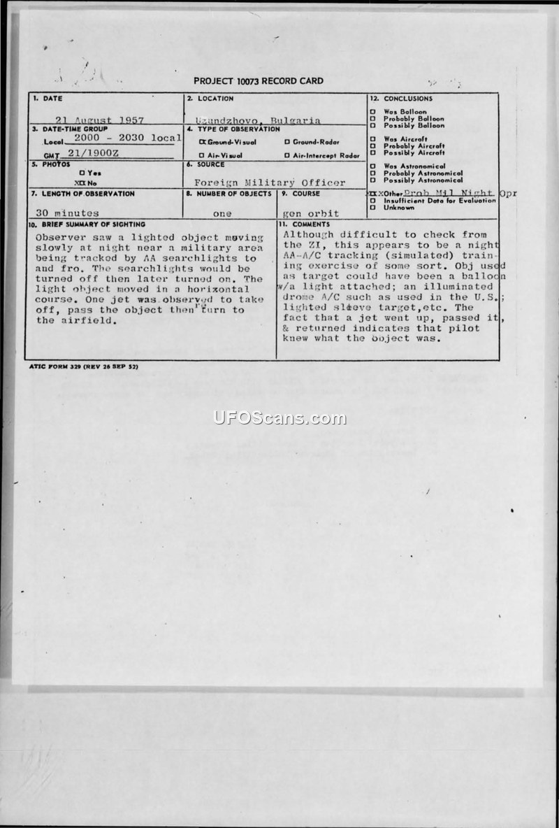 Project 10073 Record Card — Uzundzhovo, Bulgaria, 21 August 1957