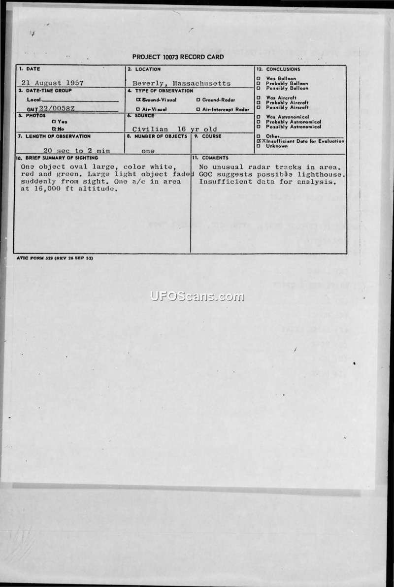Project 10073 Record Card — Beverly, Massachusetts, 21 August 1957