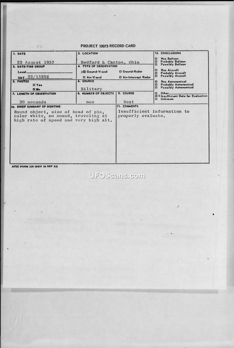 A 1957 military sighting report from Ohio describes a high-speed, high-altitude white object. The investigation concluded there was insufficient data to identify the object, though a balloon was suggested as a possibility.
