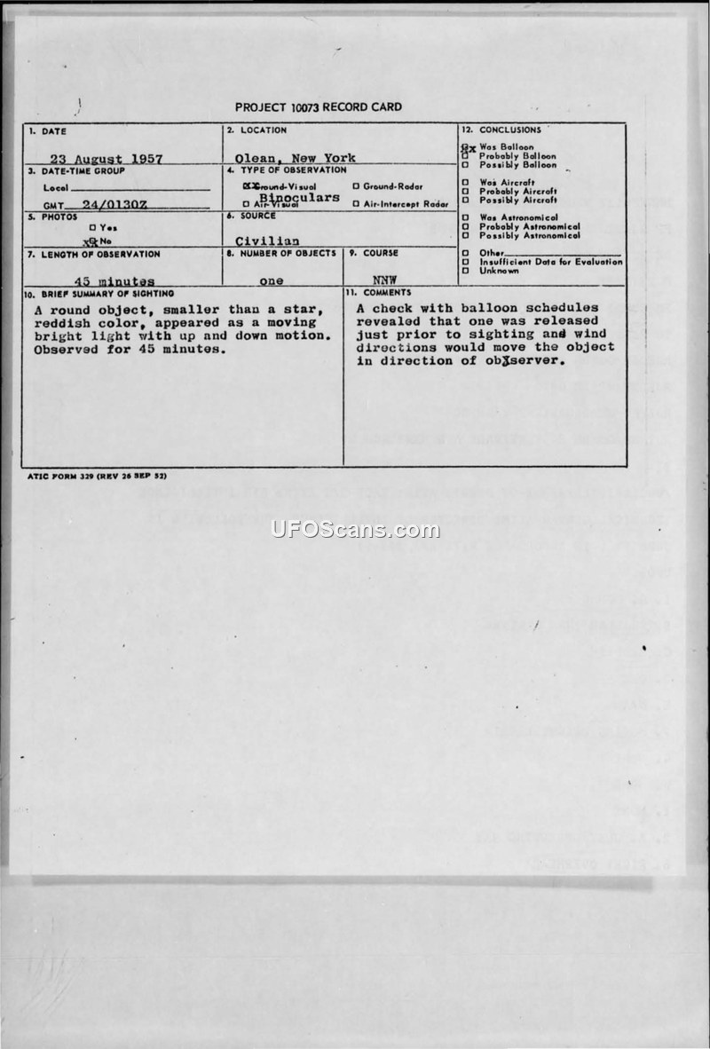 Project 10073 Record Card — Olean, New York, 23 August 1957
