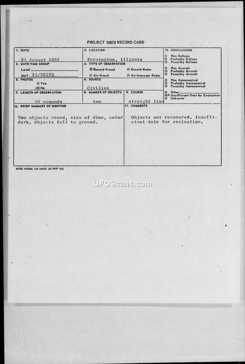 A civilian in Farmington, Illinois, reported two small, dark, round objects falling to the ground on August 24, 1957. The military investigation concluded there was insufficient data to evaluate the sighting.