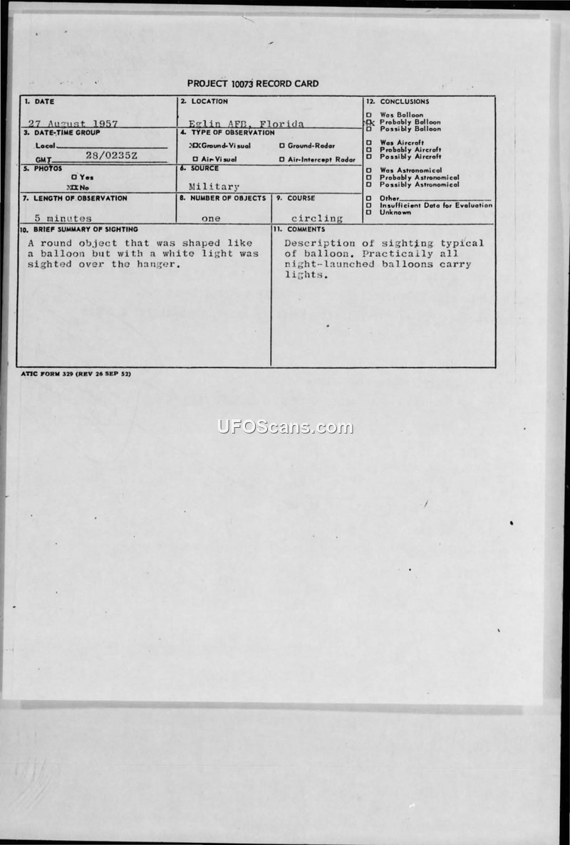 A sighting of a round, light-emitting object at Eglin AFB in 1957 was investigated by the Air Technical Intelligence Center. The object was officially identified as a night-launched weather balloon.