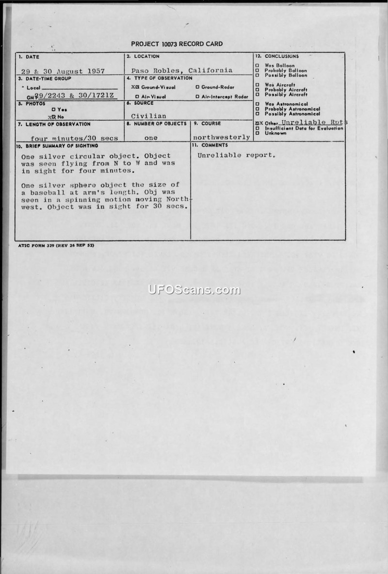 This document consists of a Project 10073 record card and associated teletype reports regarding two sightings of an unidentified aerial object near Paso Robles, California, on August 29 and 30, 1957. The reports were filed by Ground Observer Corps (GOC) personnel stationed at a post located at the Paso Robles Boys School, a corrective institution. The first sighting, reported by Jerry Bunting, described a silver, circular object moving from north to west for a duration of four minutes. The second sighting, reported by Leroy Taylor, described a silver sphere the size of a baseball at arm's length, moving in a spinning motion toward the northwest for 30 seconds. The official evaluation of these reports is that they are unreliable. This conclusion is supported by remarks from Captain Barlow of the 4771st GOC Squadron, who noted that the post had a history of submitting 'prankish reports.' Furthermore, the observers were noted to be young, and their reliability was questioned by the reporting officers. Despite the skepticism, the reports were processed through military channels, including the 669th ACWRON and the Air Technical Intelligence Center, as part of standard UFO reporting procedures.