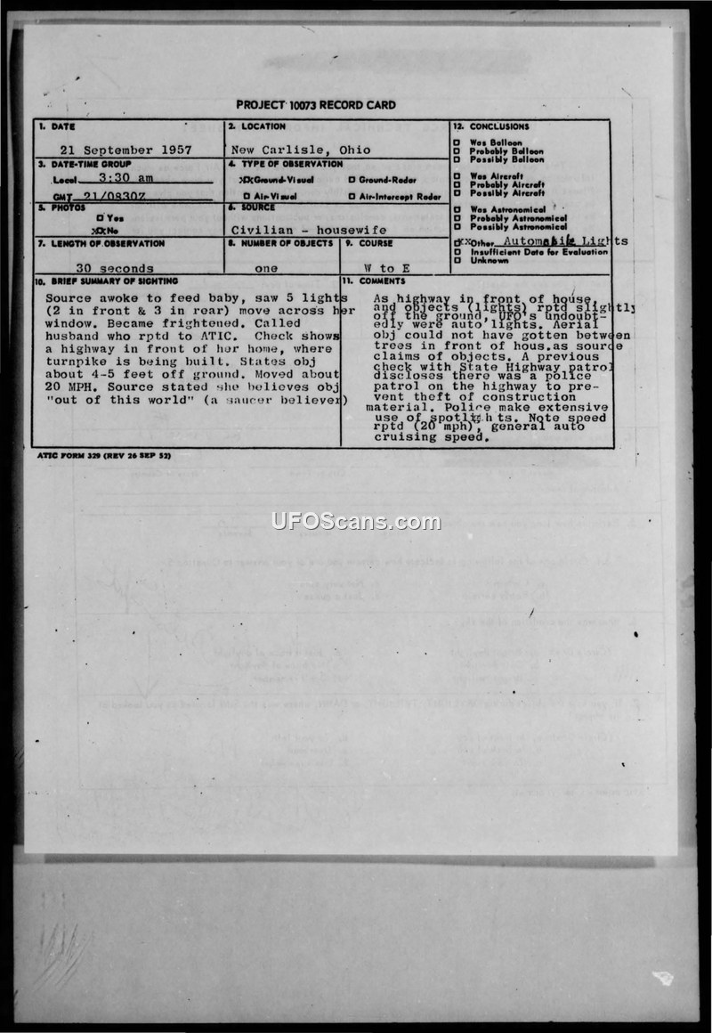 This document is a Project 10073 record card detailing a sighting reported by a housewife in New Carlisle, Ohio, on September 21, 1957. At approximately 3:30 am, the witness, who had awakened to feed her baby, observed five lights—two in the front and three in the rear—moving from west to east across her window. She estimated the objects were traveling at 20 mph and were positioned 4 to 5 feet off the ground. The witness, who described herself as a 'saucer believer,' stated she felt the objects were 'out of this world.' Her husband reported the incident to the Air Technical Intelligence Center (ATIC). The official investigation concluded that the objects were, in fact, automobile lights. The report notes that a highway was under construction in front of the witness's home, and the State Highway patrol had been conducting police patrols in the area, making extensive use of spotlights. The investigators determined that the reported speed of 20 mph was consistent with normal automobile cruising speeds and that the objects could not have maneuvered between the trees in front of the house as the witness claimed, further supporting the conclusion that the sighting was terrestrial in origin.