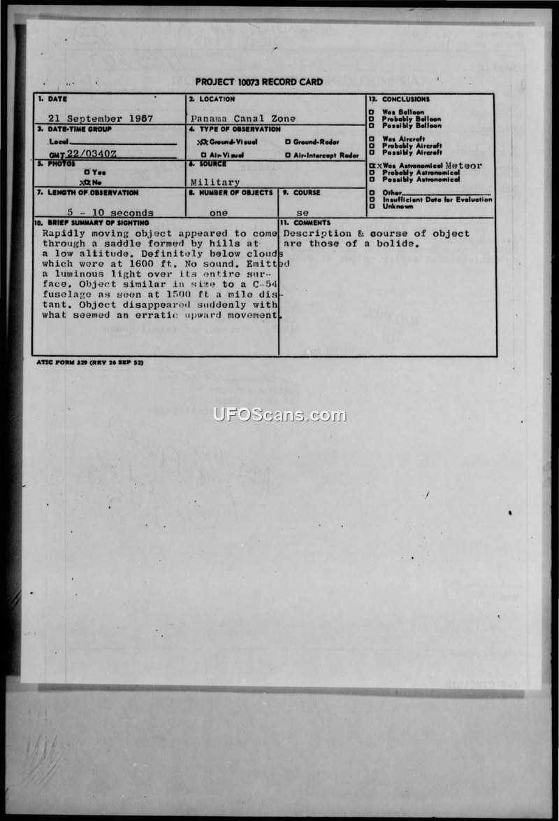 Pvt. William T. Hannon reported a cigar-shaped, luminescent object in the Panama Canal Zone on 21 September 1957. Intelligence officers concluded the sighting was a bolide or fire ball associated with local thunderstorm activity.