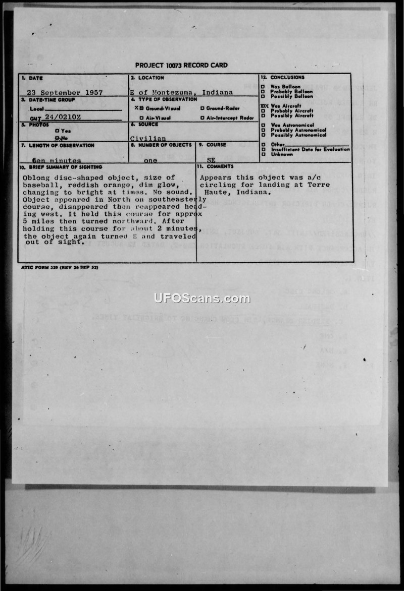 Project 10073 Record Card: Sighting near Montezuma, Indiana, 23 September 1957
