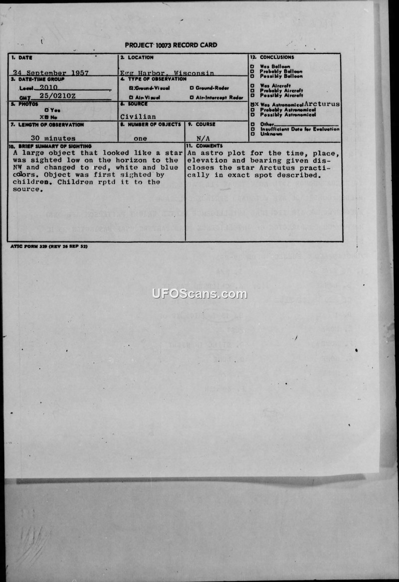 A 1957 sighting of a star-like object in Egg Harbor, Wisconsin, was investigated by the Air Technical Intelligence Center. The object was identified as the star Arcturus based on astronomical plotting.