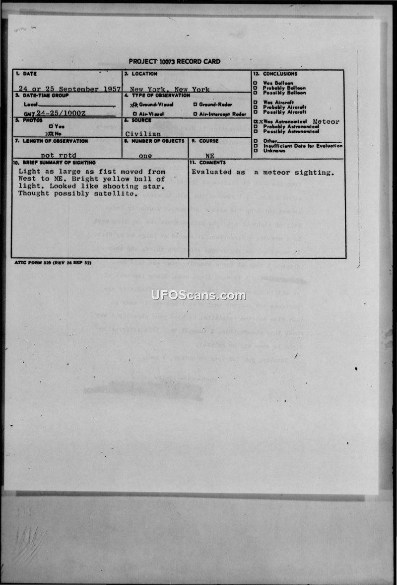 A civilian reported a bright yellow object in the New York City sky in September 1957. The Air Force officially evaluated the sighting as a meteor.