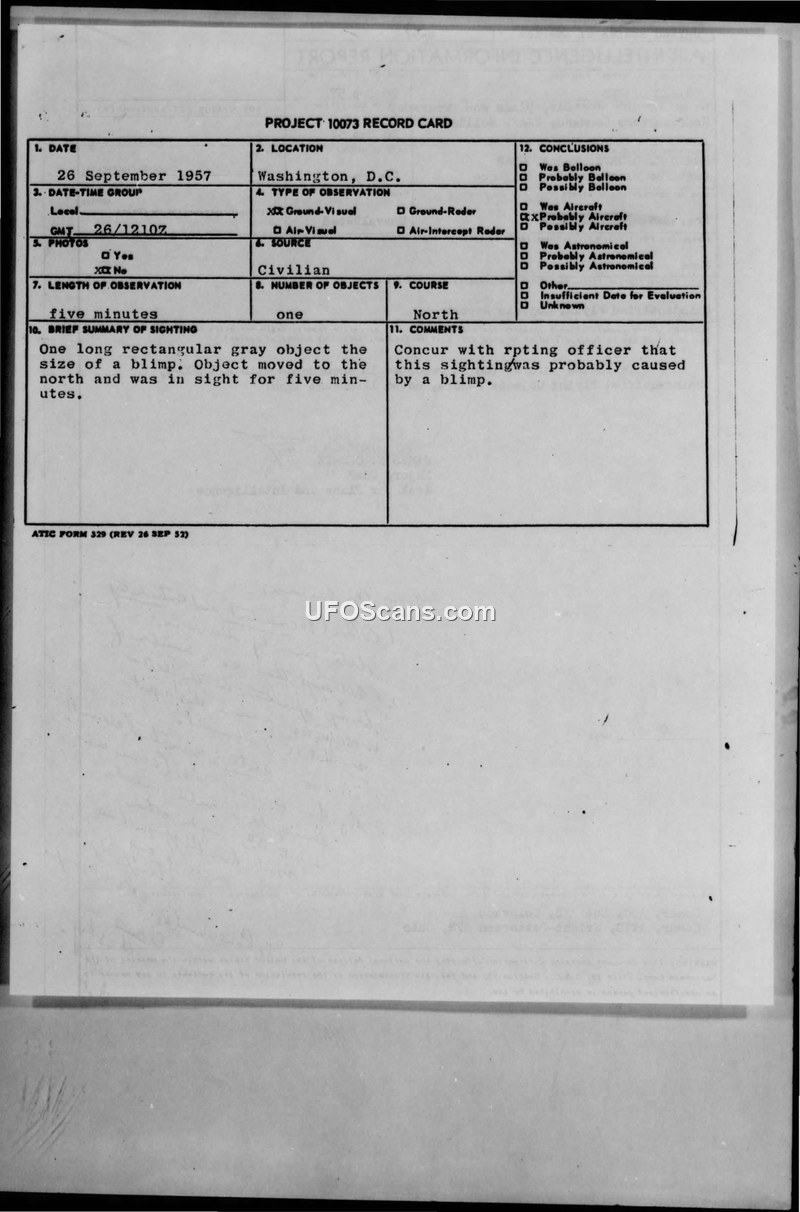 This document consists of a Project 10073 Record Card and an Air Intelligence Information Report regarding a UFO sighting on 26 September 1957 in Washington, D.C. Three civilian witnesses reported seeing a long, rectangular, gray object, described as being the size of a blimp, moving to the north. The observation lasted for approximately five minutes. The witnesses were traveling by car from Eastover, Maryland, toward the vicinity of Nichols Avenue and Chesapeake Street in Washington, D.C. The weather was reported as mostly fair with high, thin, broken clouds above 30,000 feet and visibility of seven miles. The official conclusion reached by the Air Technical Intelligence Center (ATIC) and the reporting officer, Major James E. Geurtz, was that the sighting was likely caused by a blimp, noting that there were known blimp operations in the Washington area at the time. Handwritten annotations on the report highlight contradictions in the witness statements and suggest that the sighting was likely a blimp, despite some confusion regarding the location of the observers.