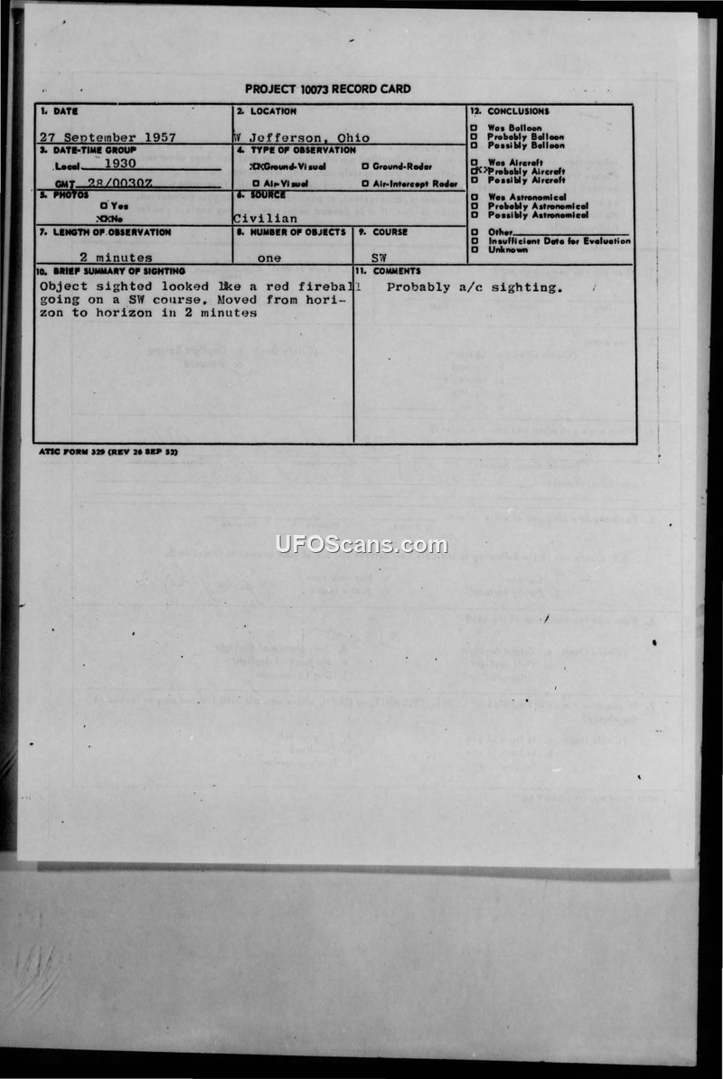 Project 10073 Record Card — Jefferson, Ohio, 27 September 1957