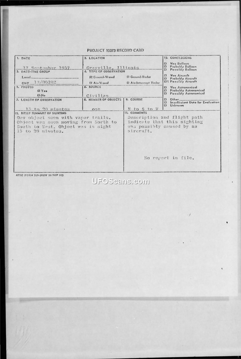 This document consists of a Project 10073 record card and a related teletype message concerning a UFO sighting on September 17, 1957. The initial report, filed under Project 10073, describes a single object observed for 15 to 20 minutes in Grayville, Illinois. The object was noted to have vapor trails and followed a flight path from North to South to West. The official conclusion on the record card states that the sighting was possibly caused by an aircraft, though it is also noted that there is no further report in the file. The second part of the document is a teletype message sent from the 337th Fighter Group in Portland, Oregon, to various Air Force commands. This message details a sighting by a witness in Gresham, Oregon, at 1930 hours. The witness, identified as a realtor, described a round object with a white color and a red edge. The red edge reportedly faded and brightened at intervals. The object was observed with low-power binoculars and appeared to move directly to a position, though it seemed much further to the west. The teletype includes standard reporting data, noting clear weather conditions. A handwritten annotation on the third page of the document suggests an alternative explanation, stating 'Prob. balloon' and noting that weather balloons are often seen at dawn or dusk. The document serves as a record of military processing for aerial phenomena reports during the late 1950s.
