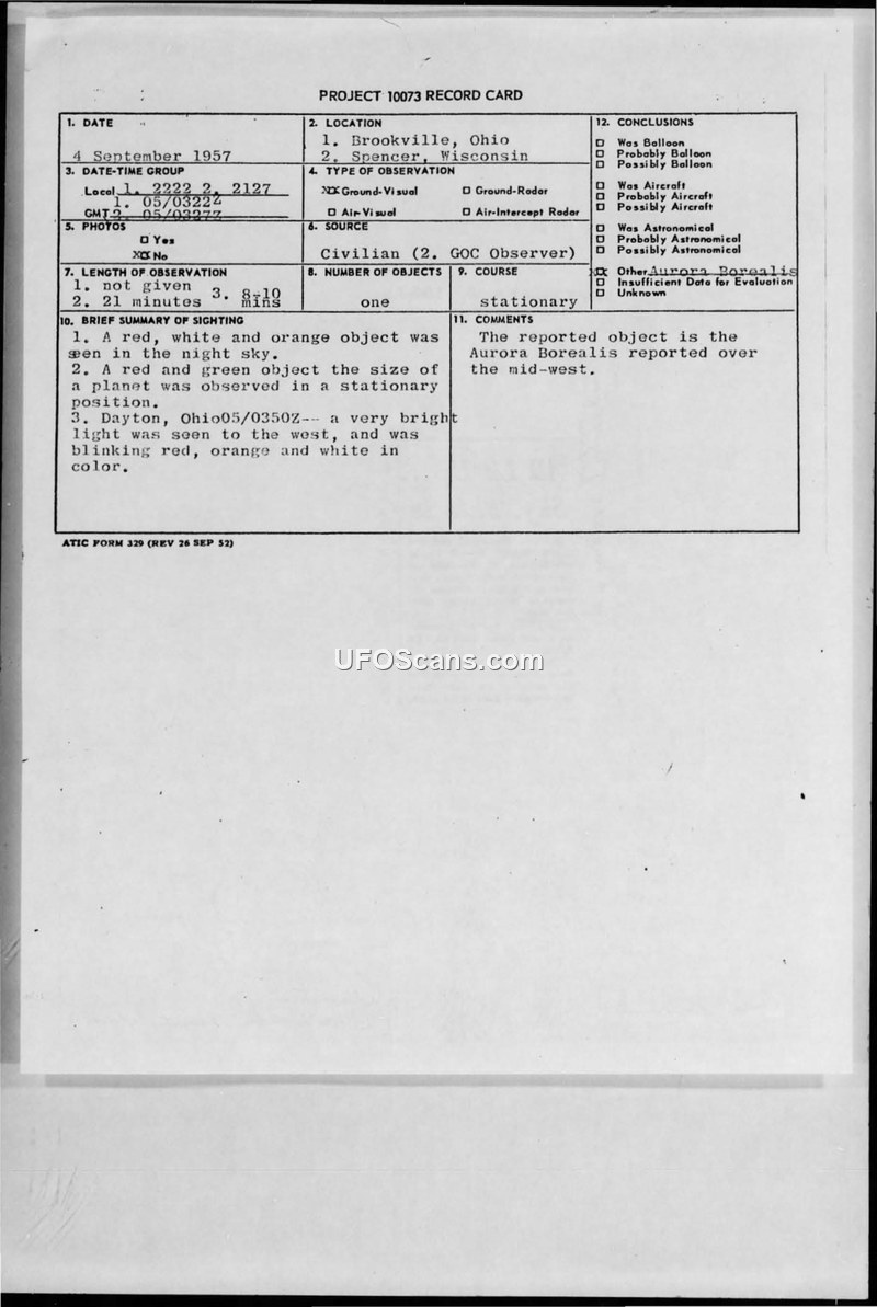 This document collection pertains to a UFO sighting reported on 4 September 1957 in the vicinity of Brookville, Ohio, and Spencer, Wisconsin. The primary record is a Project 10073 card documenting a civilian GOC observer's report of a stationary, blinking object in the night sky, described as red, white, and orange. The report includes multiple technical information sheets filled out by witnesses, as well as internal Air Force correspondence. The Air Force investigation, conducted by the Air Technical Intelligence Center (ATIC), concluded that the phenomenon was the Aurora Borealis, which was widely reported across the mid-western United States on that date. The file also contains later correspondence from 1959, where Major L. J. Tacker responded to a witness who had written to the Air Force two years after the event. Major Tacker dismissed the inquiry, stating that the report was too old to evaluate and that the witness was likely influenced by popular literature on flying saucers. The documentation includes internal military communications, such as a teletype from the 676th ACW Squadron, confirming that weather stations and operations centers were queried regarding the sighting. The consensus among the military evaluators was that the visual phenomena were atmospheric in nature, specifically aurora streamers, and not indicative of an unidentified aerial vehicle.