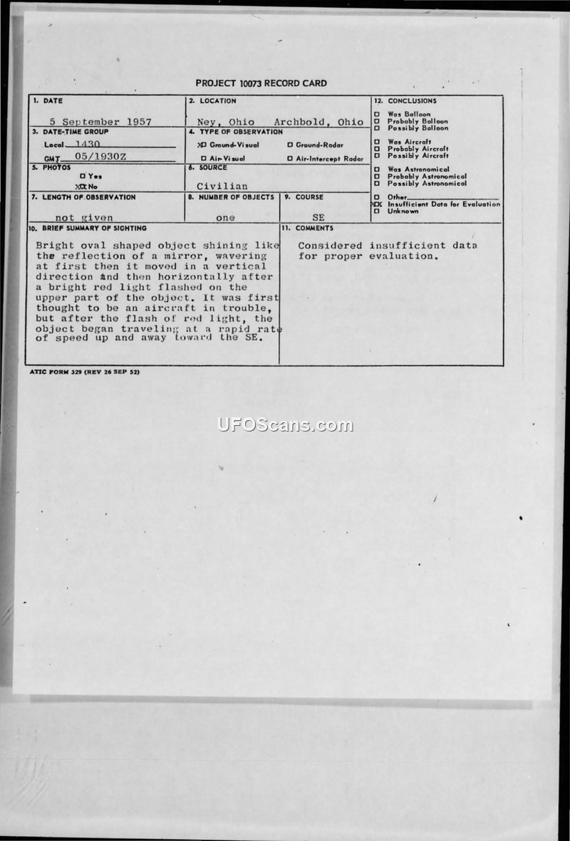 A 1957 sighting report from Ohio describes an oval, mirror-like object that displayed unusual flight characteristics. The Air Force concluded there was insufficient data to evaluate the incident.