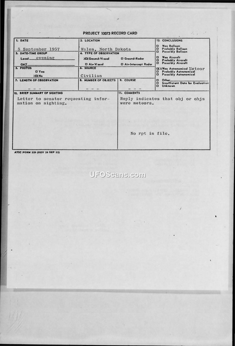 The Air Force investigated a civilian report of an unidentified object near Wales, North Dakota, in September 1957. The object was officially identified as a meteor (fireball/bolide) following consultation with the Smithsonian Astrophysical Observatory.