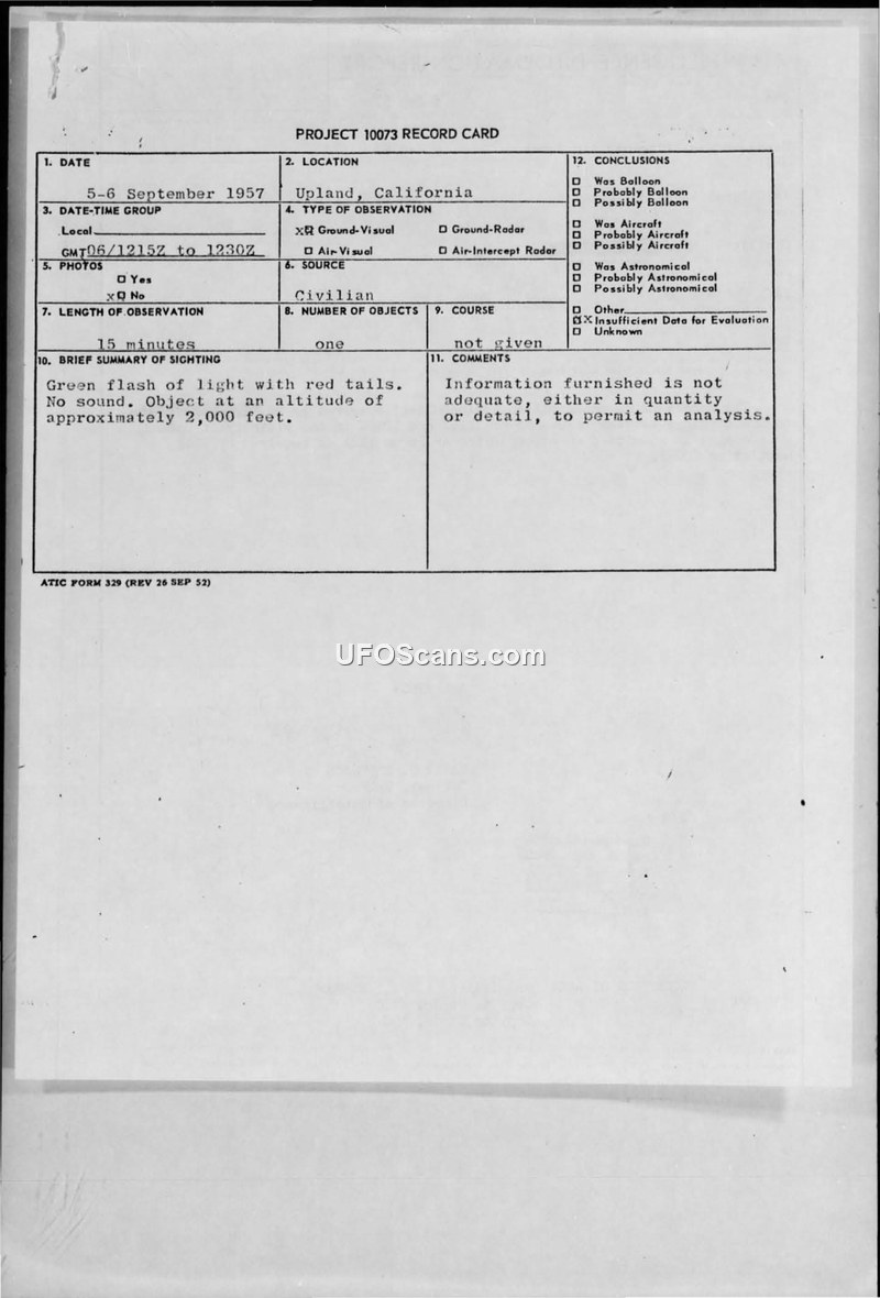 A civilian in Upland, California, reported a green light with red tails in September 1957. The Air Force concluded the report lacked sufficient detail for analysis.