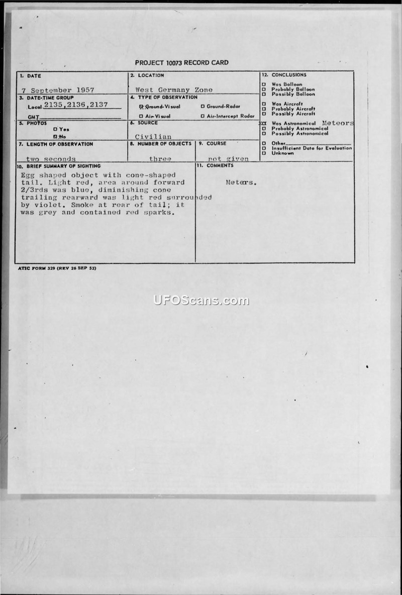 Four guards in West Germany reported three egg-shaped objects with colorful tails on 7 September 1957. The Air Technical Intelligence Center officially concluded the objects were meteors.