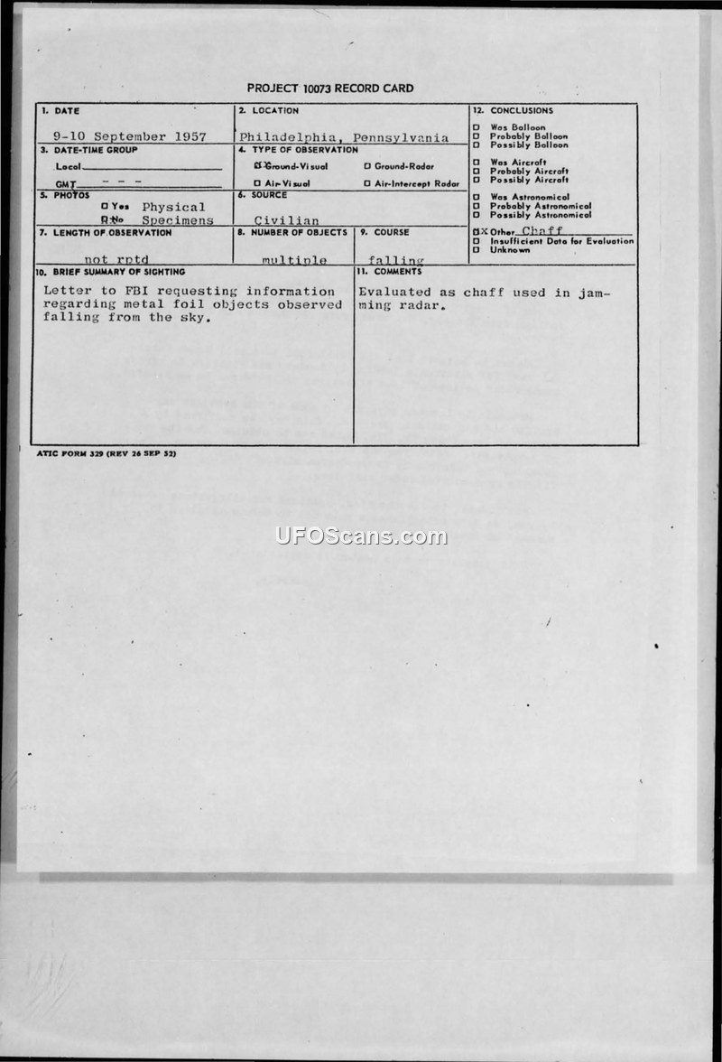 A civilian report of metallic objects falling over Philadelphia in 1957 was investigated by the Air Force and identified as military 'chaff' used for radar jamming. The documentation includes the official record card and correspondence between the Air Force and the witness.