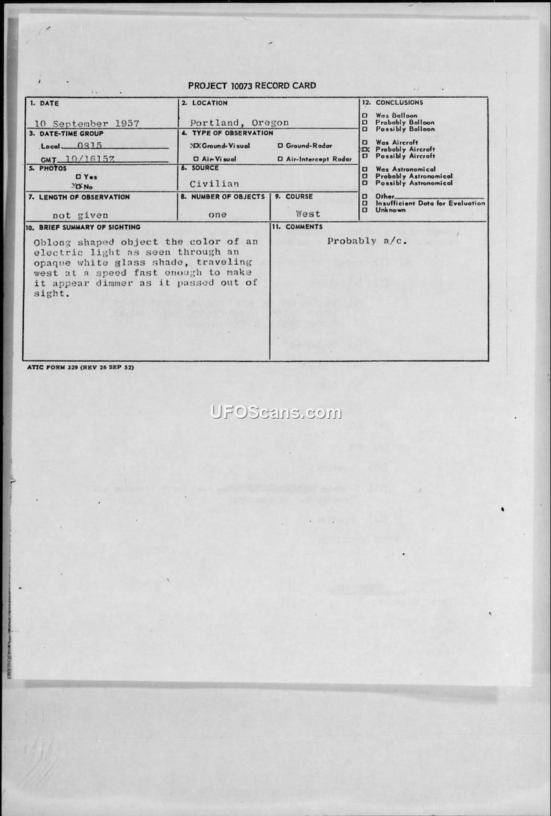 Project 10073 Record Card — Portland, Oregon, 10 September 1957
