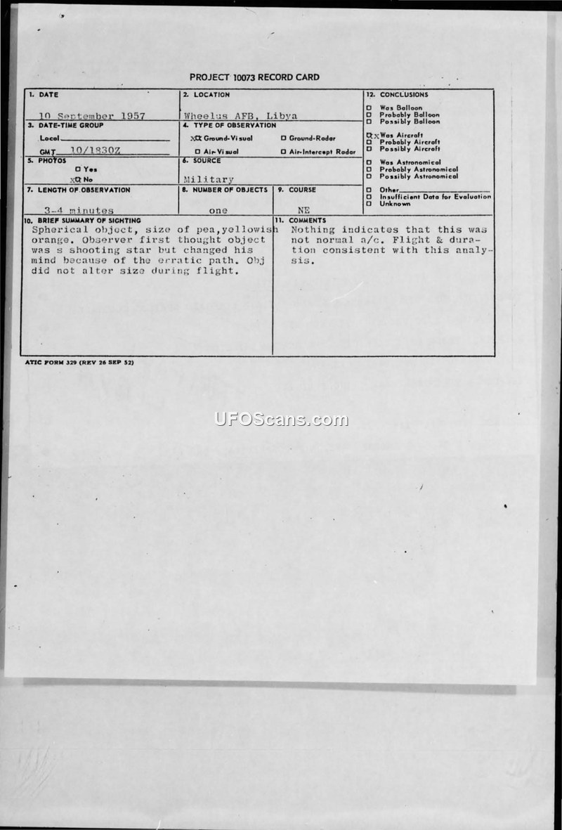 A helicopter pilot observed a spherical, yellowish-orange object over Wheelus AFB, Libya, on 10 September 1957. While officially classified as an aircraft, handwritten notes suggest the possibility of a weather balloon.