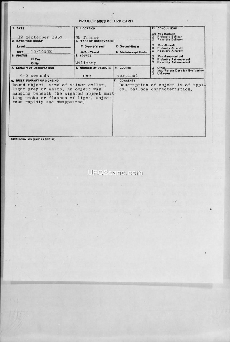 Project 10073 Record Card — NE France, 12 September 1957