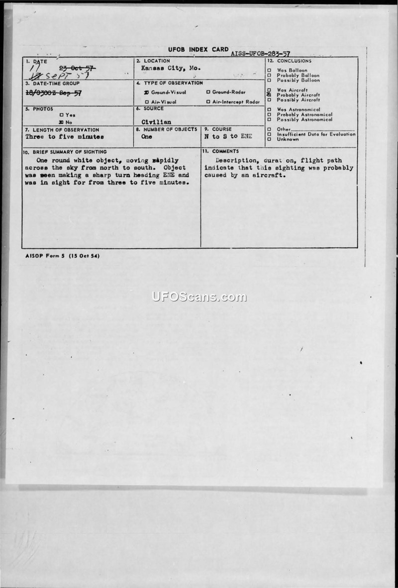 UFOB Index Cards and Related Sightings Compilation, September 1957