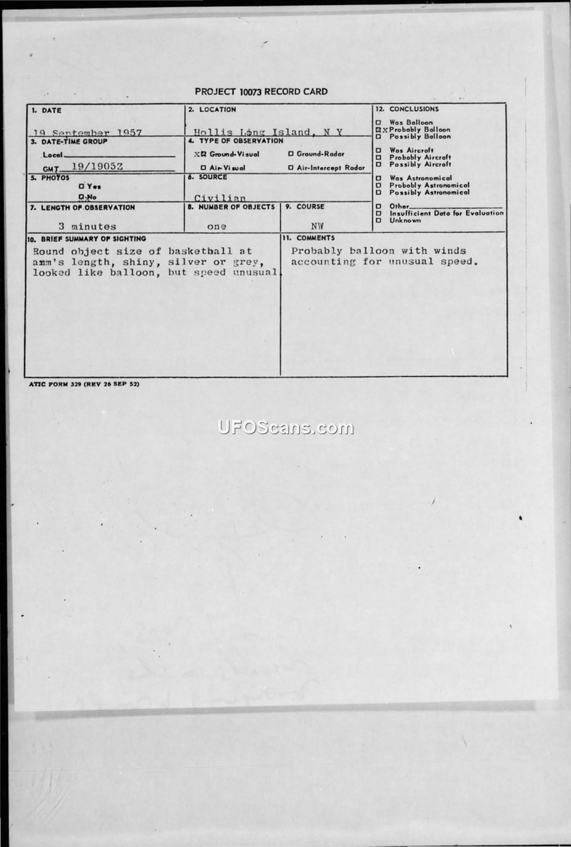 Project 10073 Record Card — Hollis, Long Island, N.Y., 19 September 1957