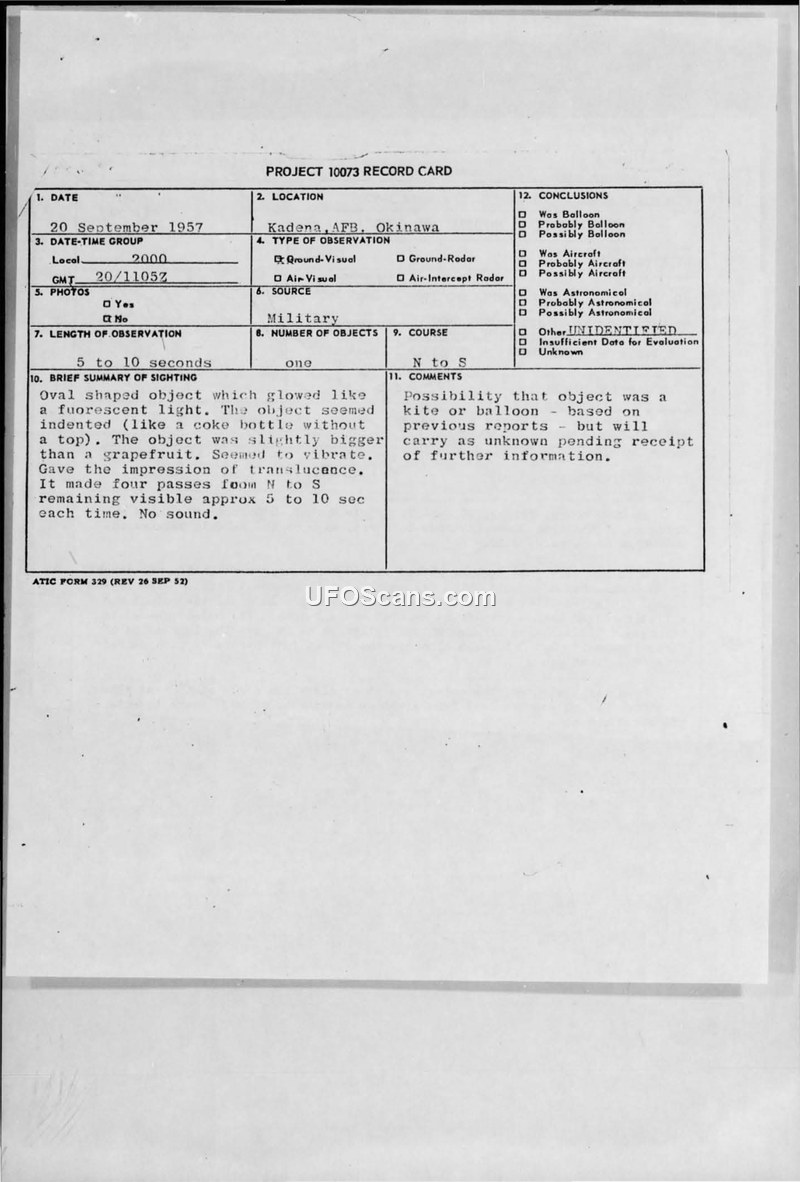 On 20 September 1957, at approximately 2000 hours, two staff sergeants from the 13th Communications Squadron, Hugh T. O'Connor and Hillis D. Bridgman, observed an unidentified aerial phenomenon while standing on the veranda of barracks 110 at Kadena Air Base, Okinawa. The witnesses described the object as oval-shaped, glowing like a fluorescent light, and indented in a manner similar to a coke bottle without a top. The object was estimated to be slightly larger than a grapefruit held at arm's length and appeared to vibrate, with one witness comparing its appearance to a jellyfish due to its translucence. The object made four distinct passes in a generally North-South direction, remaining visible for 5 to 10 seconds during each pass. The intervals between the first three passes were five minutes, while the interval before the final pass was four minutes. During the first sighting, the object traveled in a distinct arc; on subsequent passes, the flight path was level. On the final pass, the object was observed to pass directly overhead and appeared to gain altitude before disappearing into the cloud cover. No sound was heard during any of the sightings. The weather at the time was overcast with low clouds, and the object was lost from sight on an azimuth of 200 degrees. The investigating officer, 1/Lt James W. Wallace, noted that the witnesses were sincere and positive regarding their observations. Despite the detailed report, the official conclusion remained that the object might have been a kite or balloon based on previous reports, but it was officially carried as 'unknown' pending further information. The report highlights the unusual nature of the multiple sightings and the regularity of the timing, which prevented the intelligence officer from reaching a definitive explanation.