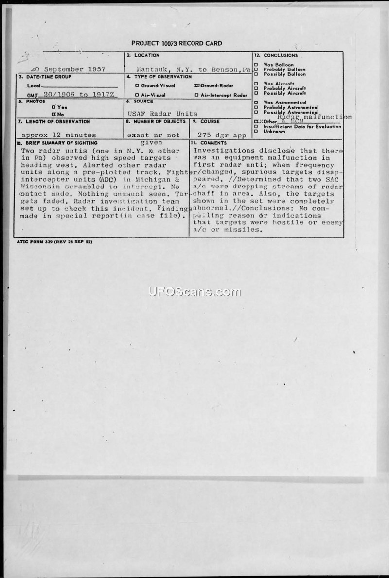 On 20 September 1957, radar stations in New York and Pennsylvania tracked unidentified high-speed objects. A subsequent NORAD investigation concluded the tracks were likely caused by radar equipment malfunctions and interference rather than actual aircraft or missiles.