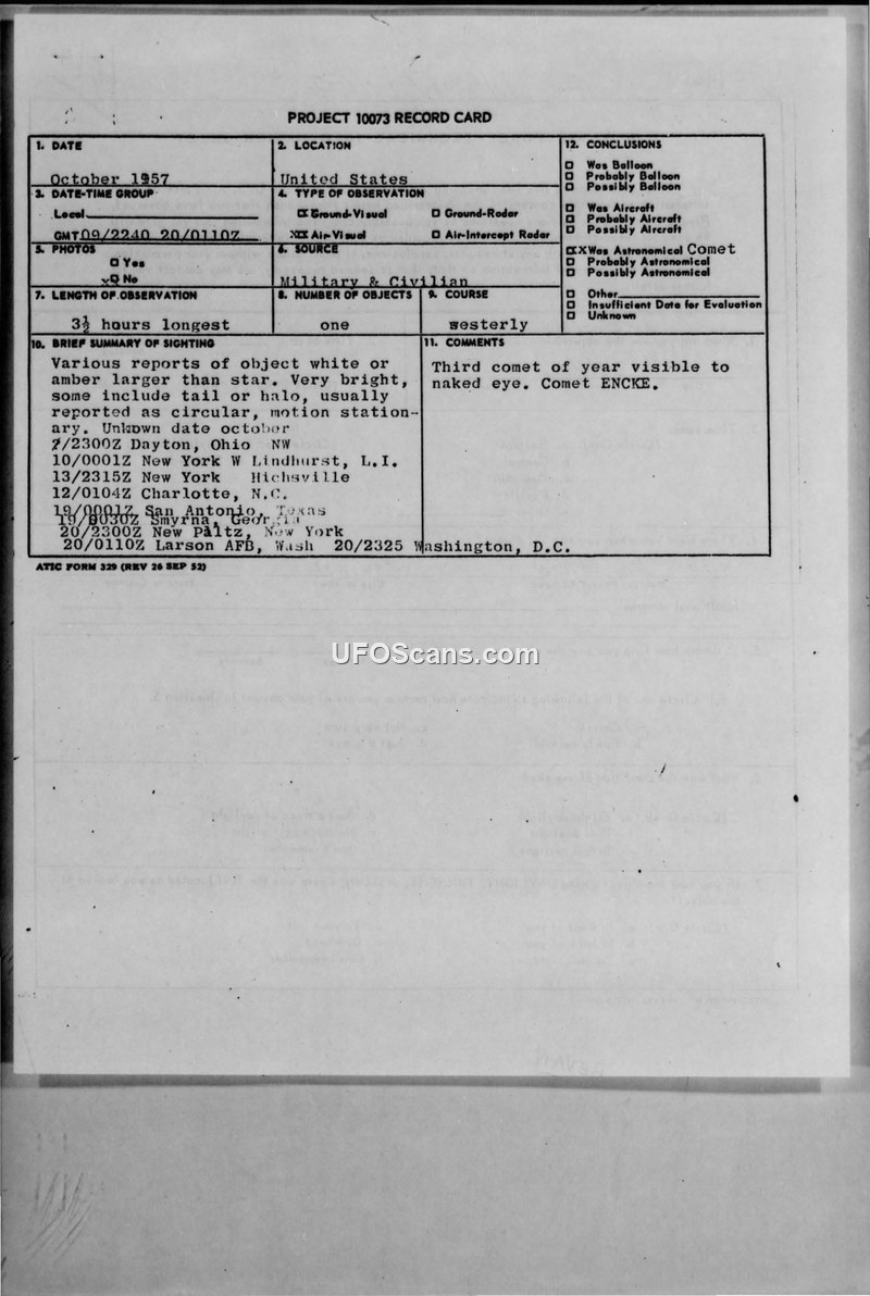This document contains a series of UAP sighting reports from October 1957, which were investigated by the US Air Force under Project 10073. The majority of these sightings were officially attributed to astronomical phenomena, such as Comet Encke and the planet Venus, or weather balloons.