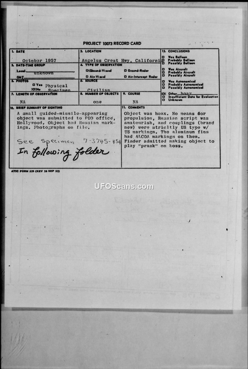 In October 1957, an employee of Bendix Radio in Van Nuys, California, reported finding a 'finned missile-like' object in the mountains near Angelus Crest Highway. The object, approximately three feet in length, featured amateurish Russian markings and was constructed using brand-new US-type cable connectors and aluminum fins bearing ALCOA markings. The individual initially presented the object to the Public Information Office (PIO) in Hollywood, leading to significant publicity. Upon investigation by the Air Force, the object was identified as a hoax. The finder eventually admitted to constructing the object as a prank to play on his supervisor. The Air Force Office of Public Information, in an effort to protect the individual from potential loss of employment or public embarrassment, agreed not to release his name. The case was documented under Project 10073, with the physical object and photographs submitted to the Air Technical Intelligence Center (ATIC) for further analysis. Correspondence between ATIC and the Western Office indicates that the Air Force was conducting a statistical survey of hoaxes and attempted hoaxes at the request of HQ USAF. There was concern that the incident might be featured on a nation-wide program, and instructions were issued to ensure the individual's name and location were not used if the story were to be broadcast.